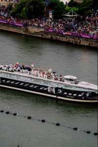 خیره کننده ترین ویژگی های این المپیک، برگزاری مراسم پر رنگ و پر شگفتی در دل شهر بزرگی بود که همه روزه نه میلیون نفر در آن رفت و آمد می کنند (که بیشتر آنها برای کار و دلایل دیگر به آن می آیند). برگزار کنندگان با آوردن قهرمانان بر روی کشتی ها، هم به آنها جذابیت های آرشیتکتوری و تاریخی -فرهنگی پاریس را نشان دادند و از همان آغاز دکور بیرونی محل زندگی شان را در روزهای بازی ها ی آنان معرفی کردند و هم مردم عادی و دوستداران ورزش را، که نتوانسته بودند بلیطی برای نشستگاههای کنار رودخانه سن بخرند، به این جشن و شادی کشاندند. جذبه ی نمایش آن چنان زیاد بود که باران های بی پایان بخش بزرگی از مراسم هم کسی را نگریزاند و همه با هیاهو به پیشواز ورزشکاران جهان رفتند ودر شادی دیگران سهیم شدند.