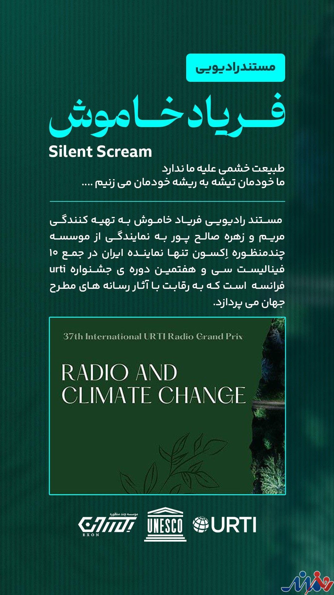 به گزارش هنرمندنیوز مستند رادیویی «فریاد خاموش» با موضوع رادیو و تغییرات اقلیمی به تهیه کنندگی زهره و مریم صالحپور از ایران -گیلان، در میان ده فینالیست نهایی سیوهفتمین دورهی «جایزه بزرگ بینالمللی رادیو URTI» قرار گرفت که برای دریافت مدال طلای این رویداد به رقابت با رسانه های مطرح جهان می پردازد.