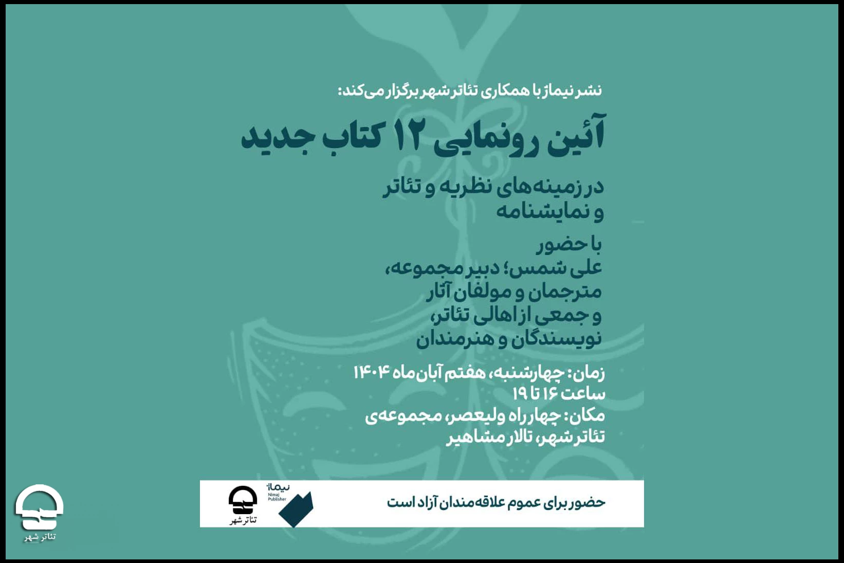 آیین رونمایی این دوازده اثر جدید در حوزهی تئاتر، ساعت ۱۶ تا ۱۹ روز چهارشنبه هفتم آبانماه در تالار مشاهیر مجموعه تئاتر شهر برگزار میشود و ورود برای عموم مخاطبان آزاد است.